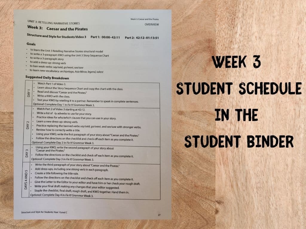 Each week’s lesson includes a one-page overview with goals, timestamps, and daily assignments.