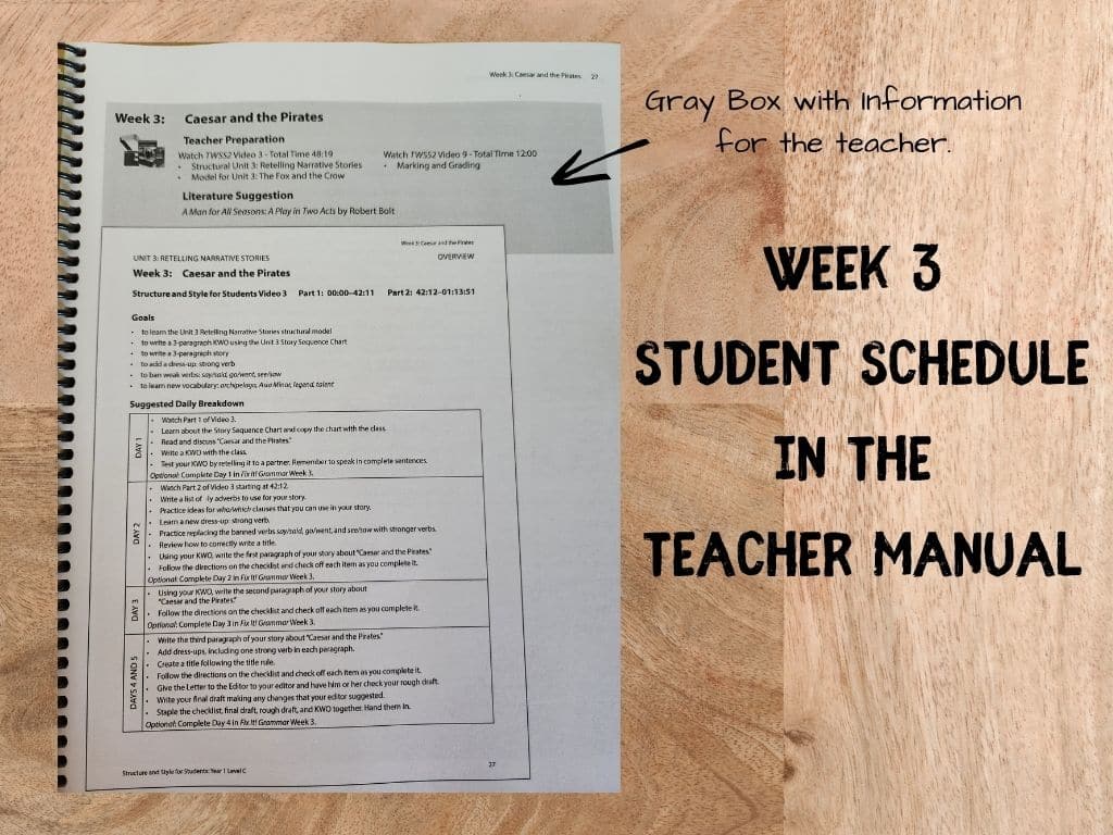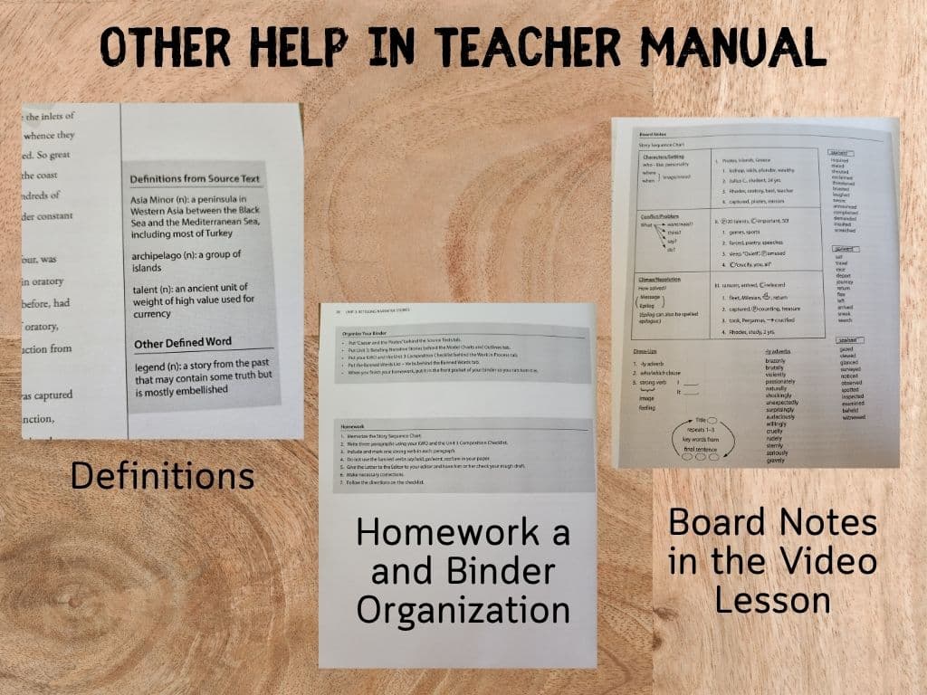 The teacher manual and student binder are very similar, but the manual includes helpful extras, like gray boxes that show you what is written on the whiteboard during student video lessons, definitions found in source texts, assigned homework, and information on where students should file their work.